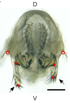 Légende: Organes génitaux mâles disséqués de D. pachea. Les lobes sont indiqués par des flèches. Des repères de mesure sont indiqués par des cercles rouges fermés et ouverts. Les axes du corps sont indiqués : G, gauche ; D, droite ; D, dorsal ; V, ventral.